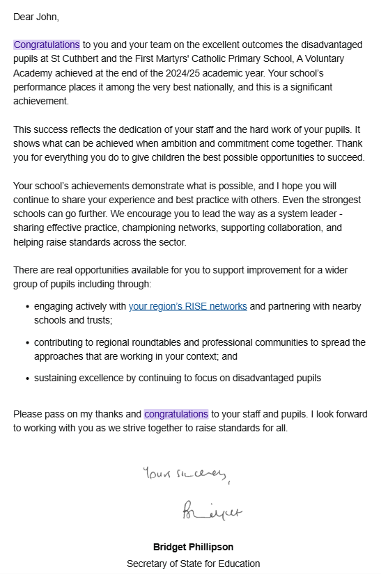 Please see the communication we received from the Secretary of State for Education in recognition of the work we do with our pupils.